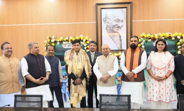 बिहार की माटी के लाल और भारतीय क्रिकेट के नए चमकते सितारे वैभव सूर्यवंशी के लिए आज का दिन उनके जीवन का सबसे यादगार पल बन गया। अंडर-19 विश्व कप 2026 में अपने बल्ले से कोहराम मचाकर भारत को छठी बार विश्व विजेता बनाने वाले 14 वर्षीय वैभव को मुख्यमंत्री नीतीश कुमार ने आज राजकीय सम्मान से नवाजा। पटना के ‘1 अणे मार्ग’ स्थित संकल्प सभागार में आयोजित एक गरिमामय समारोह में मुख्यमंत्री ने वैभव को 50 लाख रुपये का चेक, प्रशस्ति पत्र और अंगवस्त्र भेंट कर सम्मानित किया।